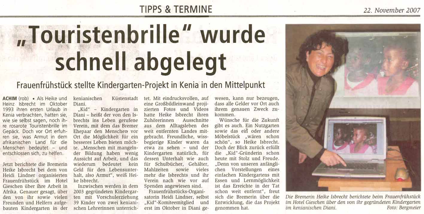 - Brinkumer Kreisblatt (16.12.2009) "Kinder spenden für Kinder in Kenia"